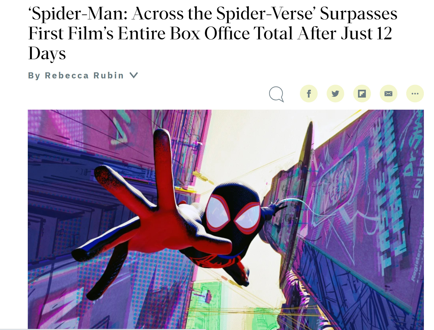 对比来说,2018年《蜘蛛侠:平行宇宙》电影票房只有3.84亿美元,而《蜘蛛侠:纵横宇宙》仅用了12天便超过了前作总票房。