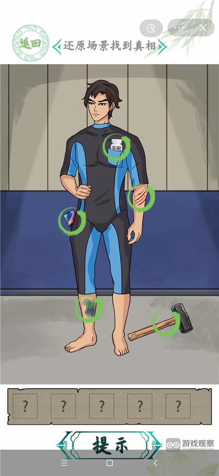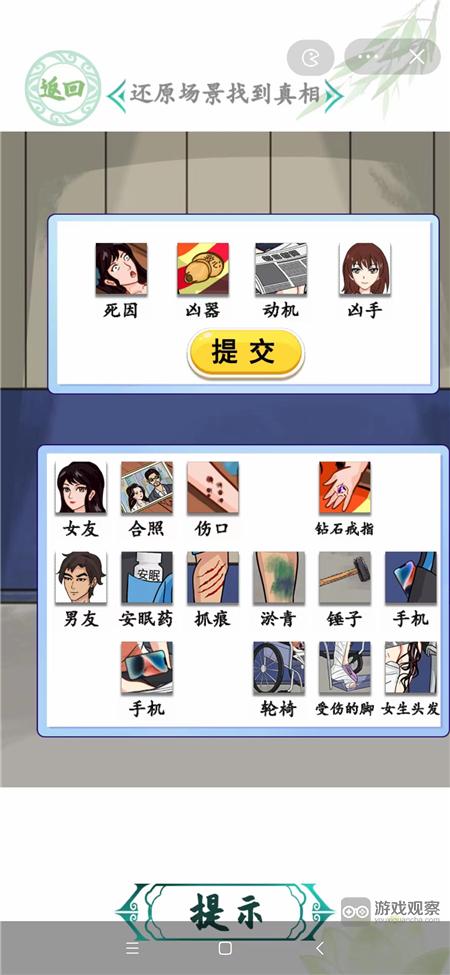 2、审问犯人分别是男友和闺蜜,男友长按右腿掉出锤子,其余物品直接点击即可