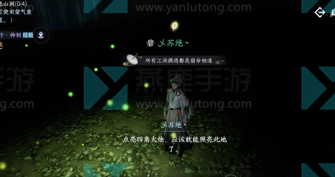 2、根据纸团上的文字想办法照亮山洞,可使用望气查看火台位置。
