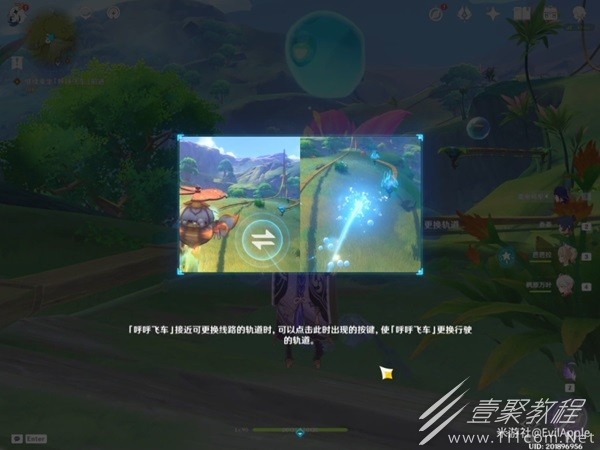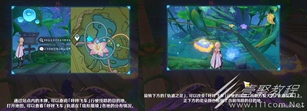 11、到这里解锁呼呼轨道新功能,可以通过查看木牌,提前查阅呼呼飞车行驶路线,旋转下方的轨道之花可以改变至对应的行使方向,正下方的花朵颜色标明了当前路线的目的地,旋转至对应颜色的花朵即可。