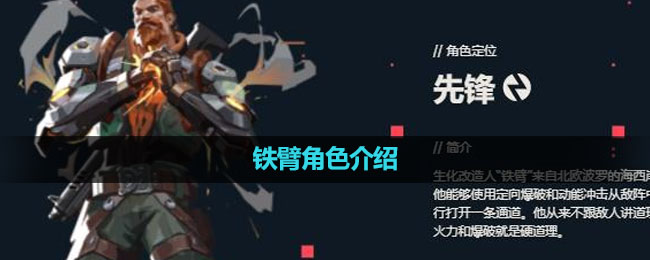 在哪无畏契约游戏中会有很多的角色可以去选择,每个角色的外观技能都不一样,当然适用的地点也是不一样的,铁臂就是其中之一,很多玩家不知道他有什么技能该怎么去玩,那么想知道铁臂角色介绍的就跟随一起来看看吧。