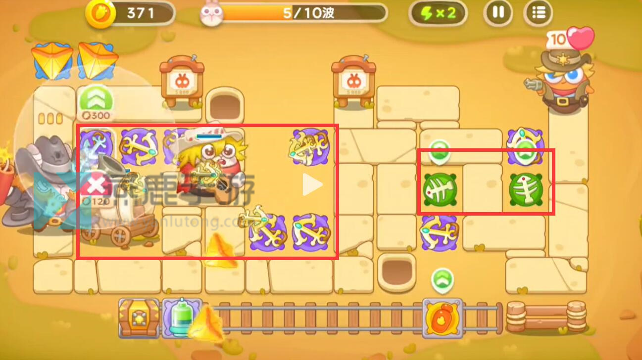 1、开局之后左上角放纸飞机大兔子,在出口下放个船锚,补伤的同时清建筑。