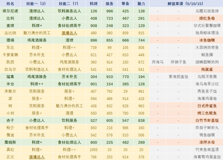 潜水员戴夫所有员工的技能、属性以及解锁的菜谱信息如下。