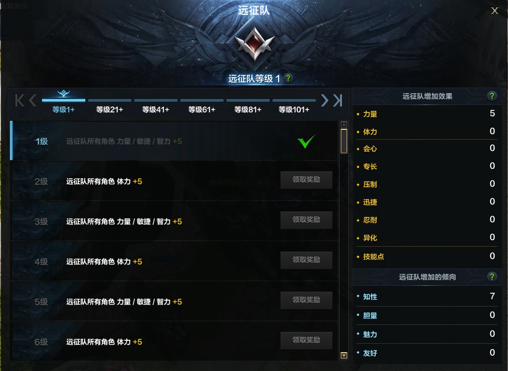 2、远征队是有等级的,可以通过各种活动来获得远征队的经验,可以为所有的角色提供力量、敏捷、智力等加成。