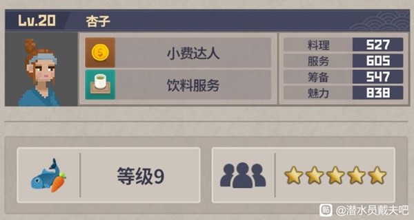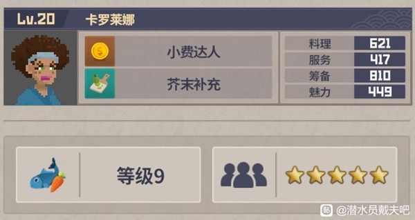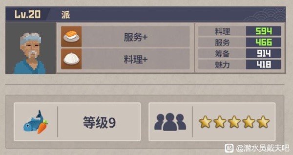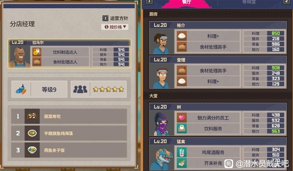20级以后,必定料理等级9,星级五颗星的几个员工。(可能有漏勿怪)还有俩个派遣员工也能双满,感觉拿来做经理有点亏。