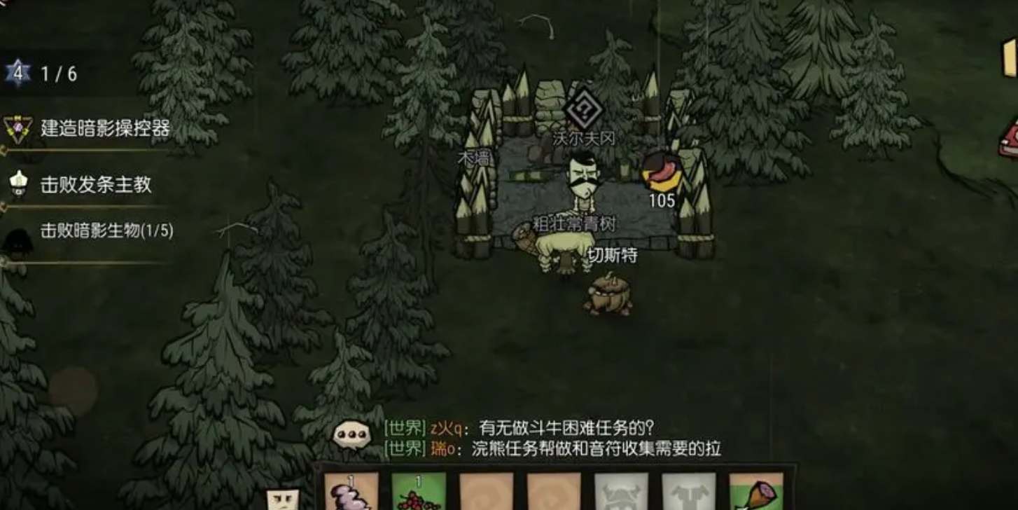 2、沃尔夫冈出现的位置是随机的,一般会出现在松树林附近,需要提交给他两个炖肉(至少3个大肉,不放树枝或蜂蜜),他吃饱了才能触发后续任务。