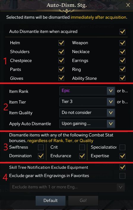 第二栏会把剩下的物品分解,包括第三栏留下的暴击专长迅速首饰,但不会分解第四栏指定的物品。