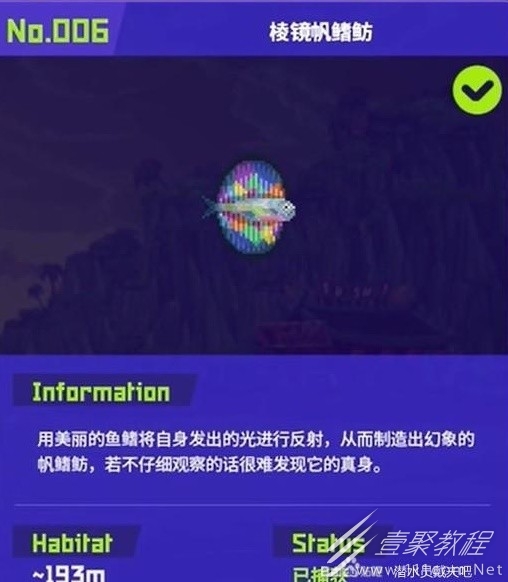 6. 棱镜帆鳍鲂:分布在193米海底海底湖靠右侧的副本海底湖,受到攻击会分裂出两个幻象,幻象受到攻击直接消失。在攻击本体达到一定程度时就可以将其捕捉。