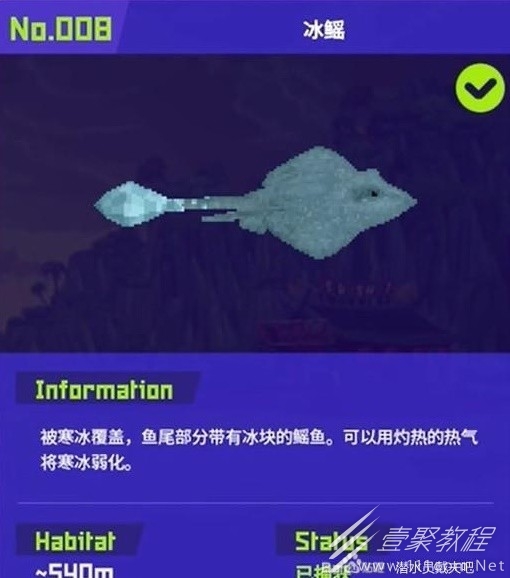 8. 冰鳐:分布在海底540米,滨河区域的第三个洞穴,靠右上方的冰层上,需要携带火属性武器。注意其尾部释放的三道冰柱和冰鳐自带的冲撞甩尾攻击,冰鳐的血量是288,所以需要注意武器的伤害。