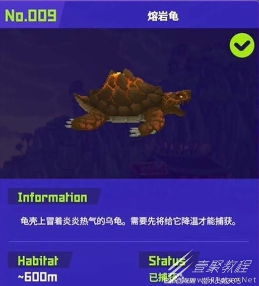 9. 熔岩龟:分布在热喷泉最下方左边的那个副本里,位于600米的海底深处。需要携带寒冰的武器,如冰属性的武器寒冰枪。使用寒冰枪将其冰冻后可以用小刀快速砍击造成伤害,可以将其捕捉。