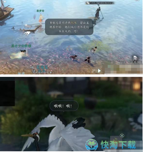 3、随后就是在溪边上,这是三个小孩旁边是有一个黑棋,将这个棋子捡起来,使用野果给仙鹤吃,仙鹤会给玩家一个黑棋子。