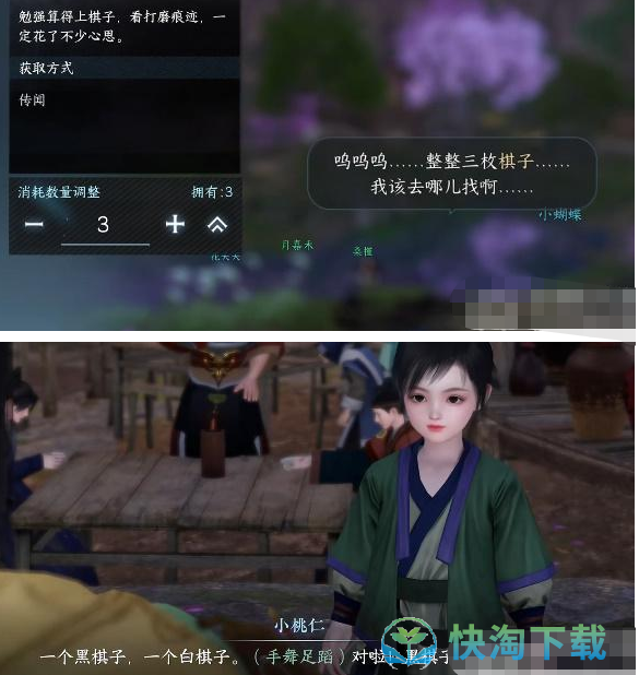 4、当然最后凑齐了3个棋子,玩家是可以将这3个棋子给小桃仁,那么跟小桃仁对话结束任务也就完成了。
