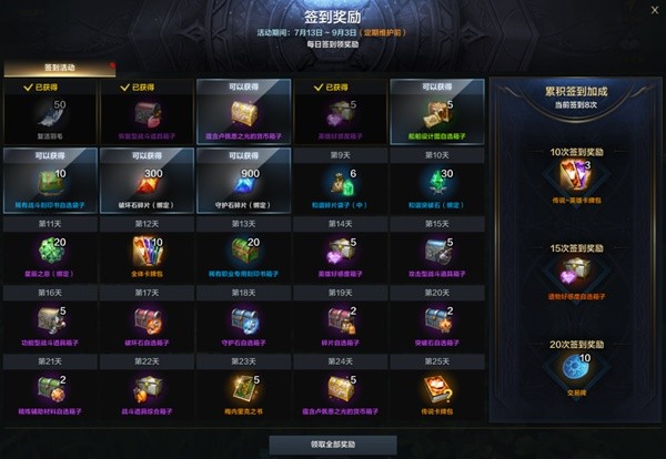 每日签到奖励,是只需登录游戏就可领取的福利,签到达指定天数,即可领取传说卡牌包(随机)、遗物好感度自选箱子、交易牌、以及海量提升材料等多重奖励;如果有冒险家当天登录游戏但未领取奖励,也不必担心,后续再登录游戏时可统一领取。