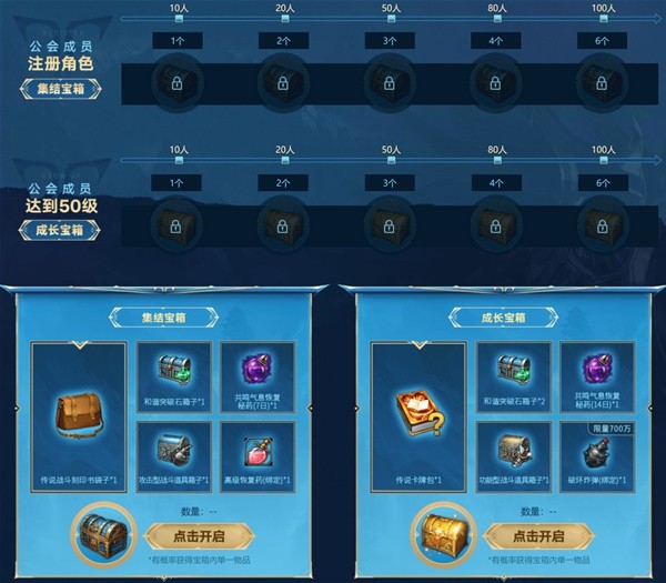 奖励分为集结宝箱和成长宝箱两种,集结宝箱需要根据公会成员人数进行领取,成长宝箱则需要公会成员达到50级才能领取,因此冒险家们在选择公会时,要注意喔。