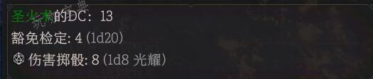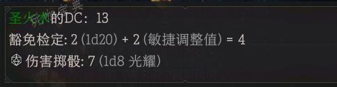 骰子是1-20的值,所以只要怪物掷出(roll点)大于12的值,就会免疫圣火术的伤害(非有效命中),大概8/20的概率(40%)。但实际过程中结算的值会在roll点基础上加上各种各样由怪物属性等因素的附加值,所以其实圣火术的实际造成伤害的概率会降低。