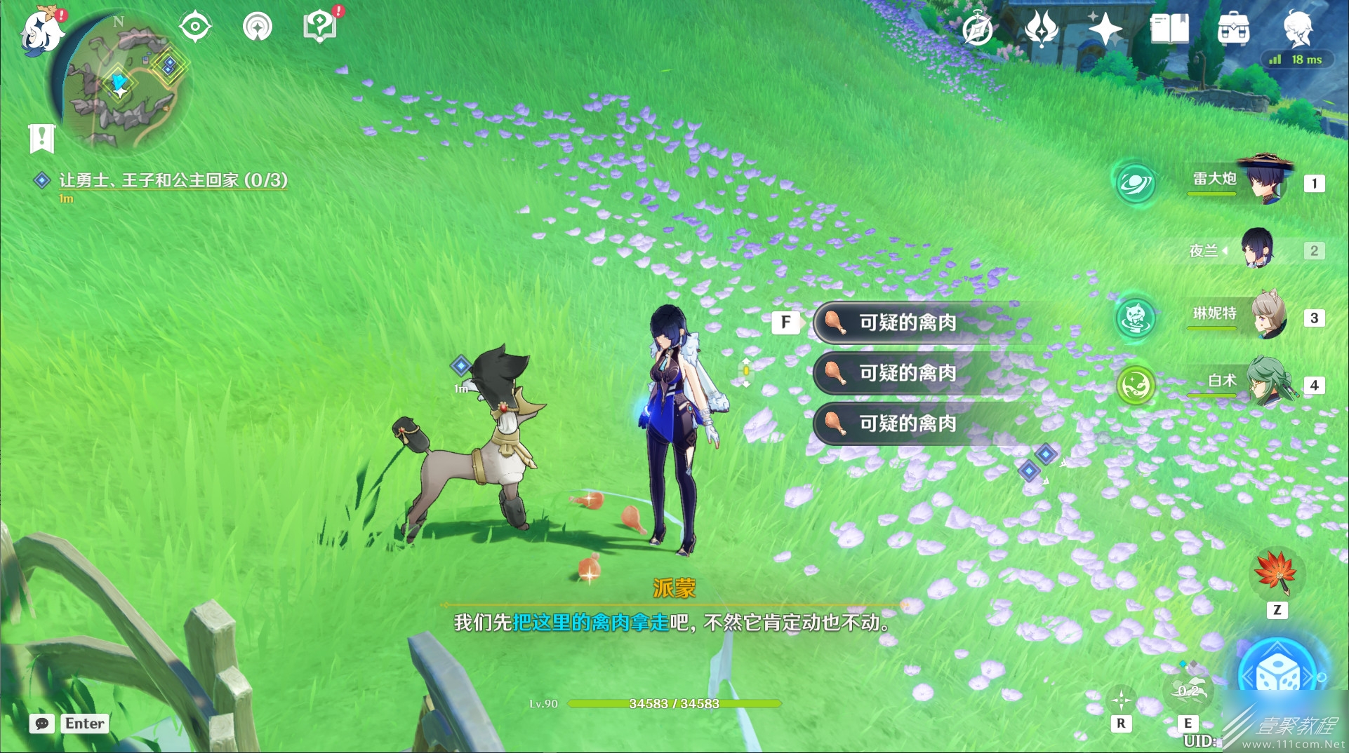 ①拿走可疑的禽肉*3后,跟着“勇士”回去:如果在路上它不走了,我们可以多走几步看看打败出现的史莱姆,然后近距离跟着它走在它前面带着它回去,我觉得这里有些问题,它老原地不动,赶了半天!