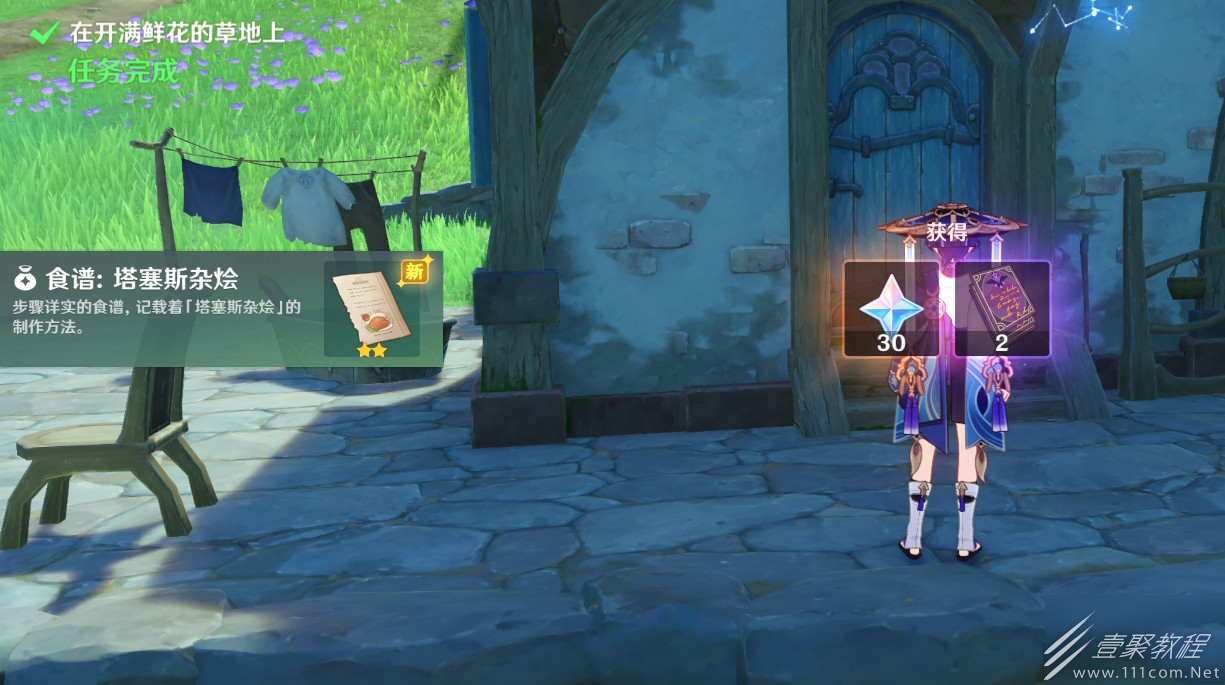 3.与恩肖对话:在他家吃饭后完成任务,获得食谱【塔赛斯杂烩】。