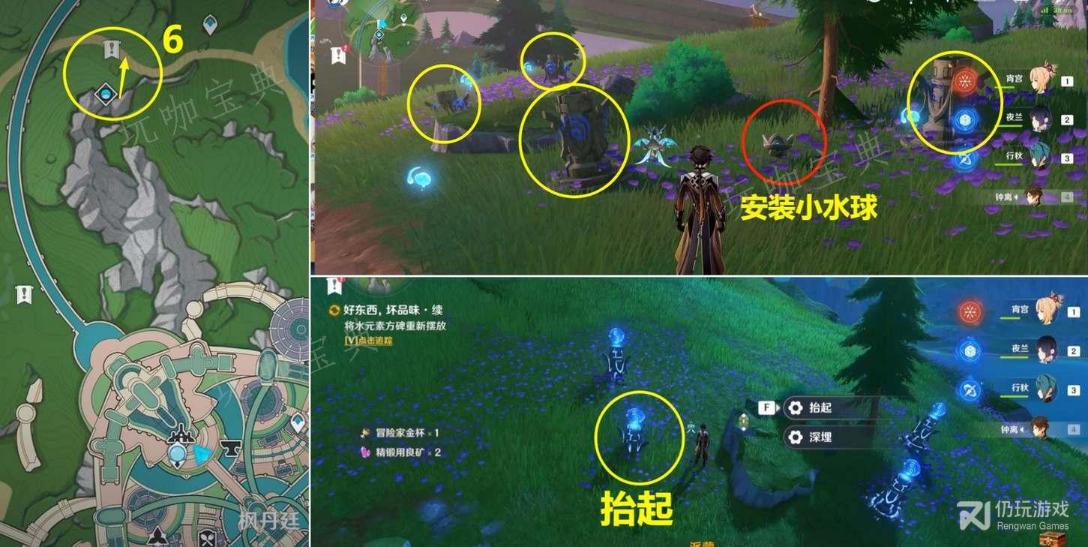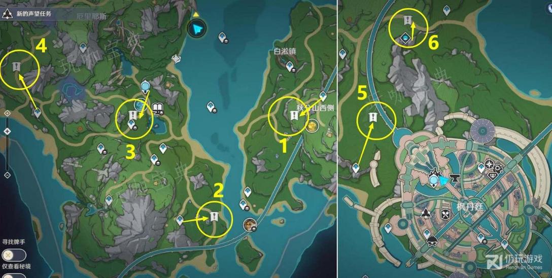 1、4.0枫丹隐隐藏任务“好东西,坏品味”可以接取6次,接取的地点如下图所示。前5个点位没有固定顺序,但是必须将钱5个完成之后才能进行第6个水元素方碑解密。
