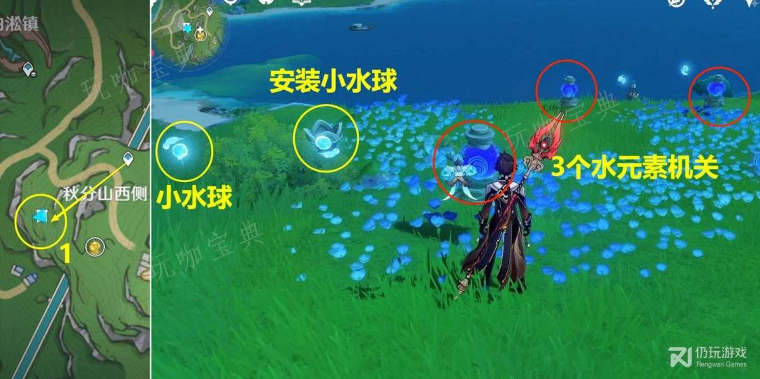 2、第一处解密在【秋风山西侧】,拾取附近3个小水球放在装置中激活大水圈,然后带着水圈去激活剩下的2个水元素机关完成解密获得宝箱。