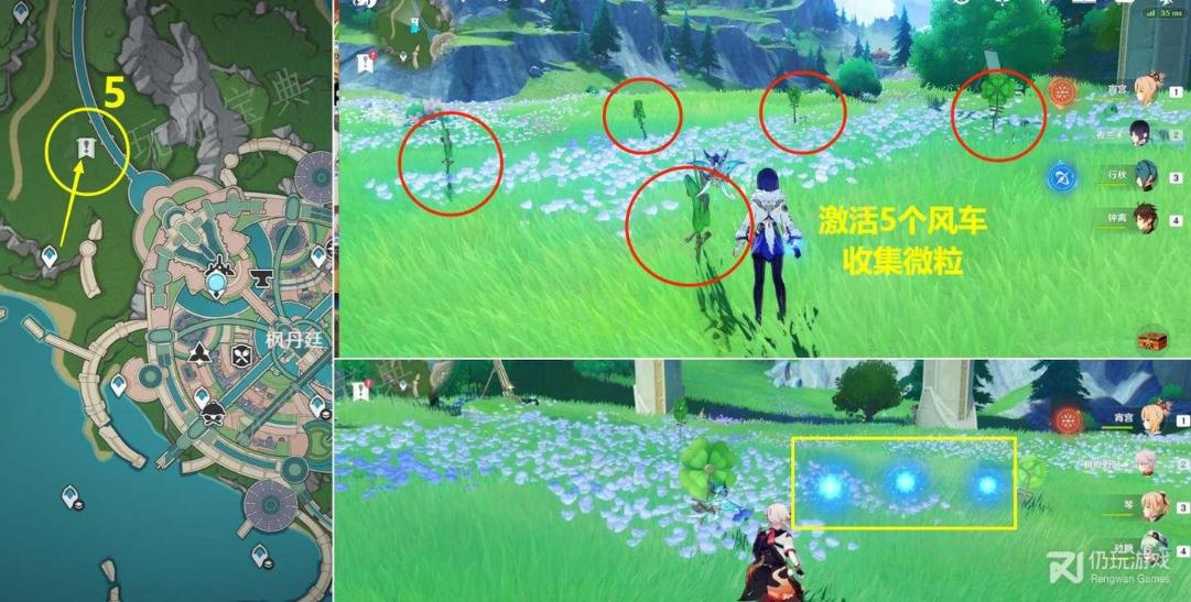 6、第5处枫丹廷,用风元素角色依次将5个风车激活后,并收集完出现的微粒后可以开启任务。