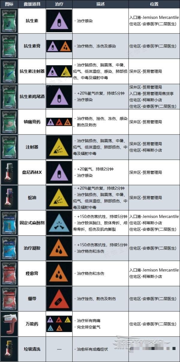 打开物品栏,选中【救援】分类,滚动查看拥有的食物和治疗物品,有些物品会在描述中写出它可以治疗的疾病,敌人有概率掉落或在开放世界中探索时有概率拾取到。