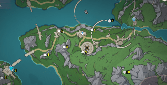 1、黎翡区(1-10),我们可以先从左侧位置开始进行收集,这样的话正好按照顺序来进行的,最后我们前往靠下方的水神瞳即可。
