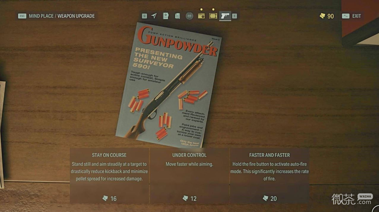 手枪是你将在剧情章节中频繁使用的武器。 我们推荐你选择“弹匣扩容”(More Bullets)升级来减少自己的装弹次数。