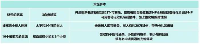 以上是本次活动的加成从者,如果有仇凛或者卡莲的话,可以在本次活动刷大部分怪异本。