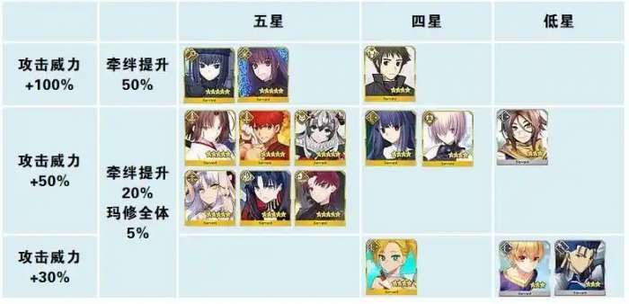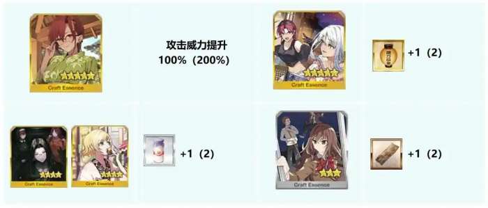 以上是本次活动的礼装加成情况,赠送礼装是伤害加成,卡池礼装是商店材料加成,因为有小击退战所以需求不是特别大。