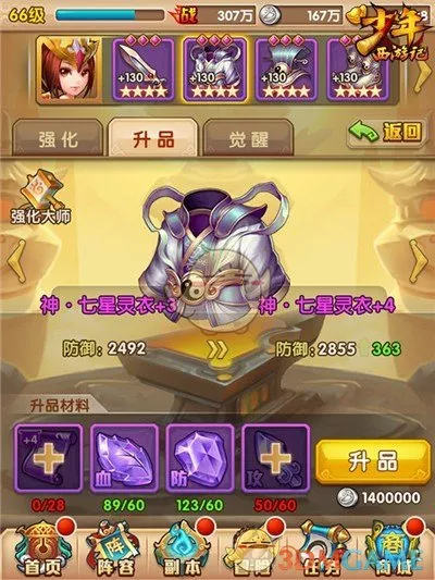 消耗银币可行小幅度提升装备基础属性,提升到限定等级后,须要对装备进行“升品”(提升颜色品质)。