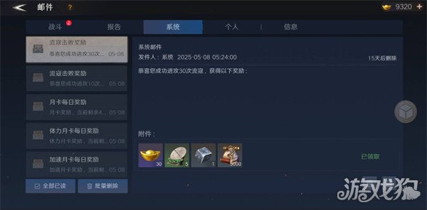 在城外攻打流寇,攻打到一定次数,邮件会自动发放奖励。