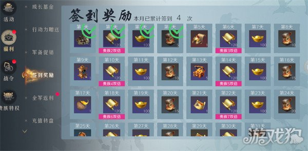 右上角活动-福利-签到奖励,签到第3天、第7天、第11天、第15天、第19天、第23天、第27天都可以获得100元宝奖励。