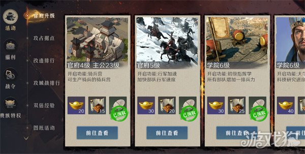 官府、学院升到指定等级,可以到右上角活动-官方升级领取奖励。