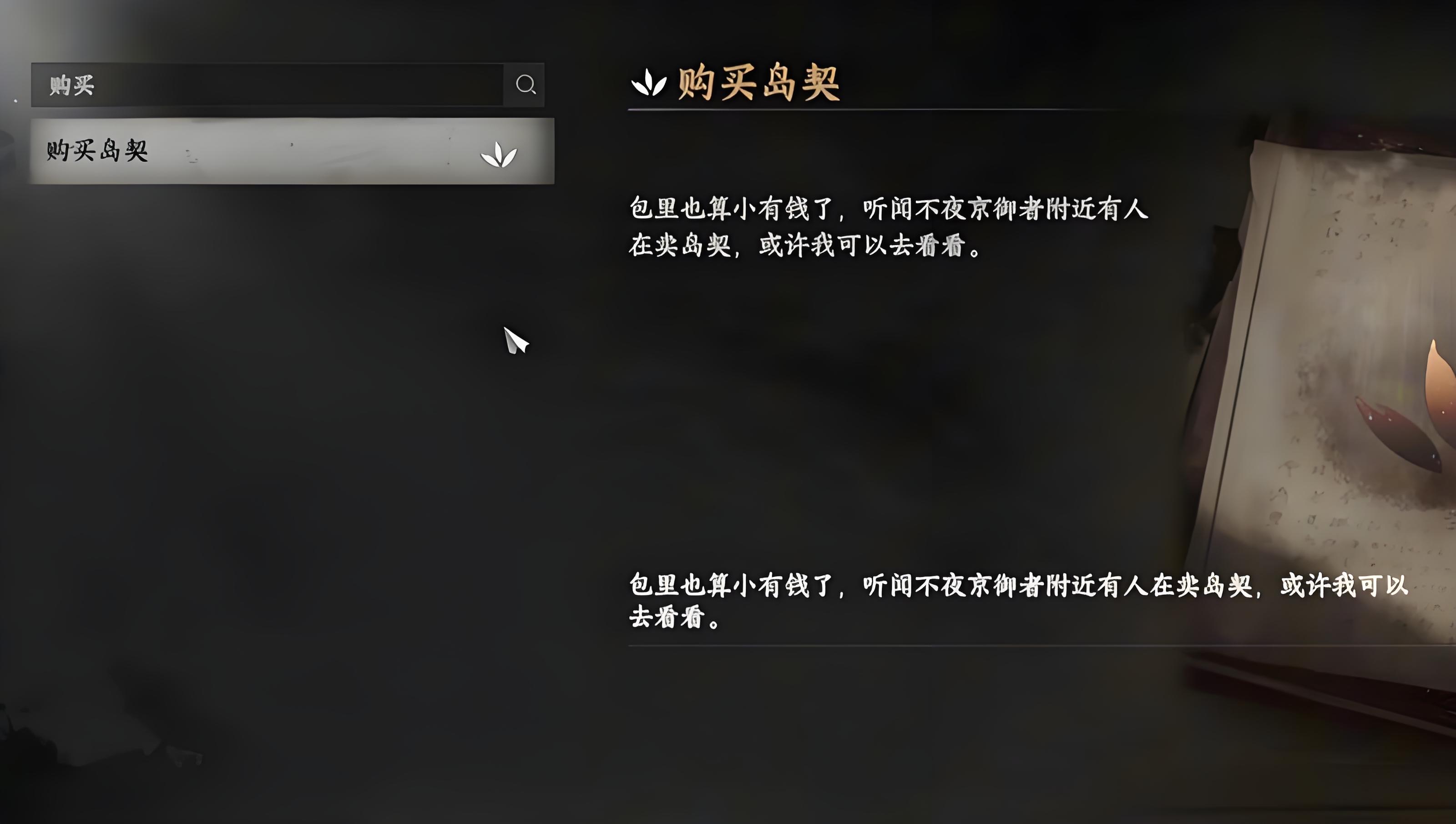 1、获取岛契有两种途径,一是准备足够铜钱去不夜城找岛契商人购买,购买前需击败阻拦的怪物,二是自行前往监牢岛,找到车夫NPC即可免费领取。