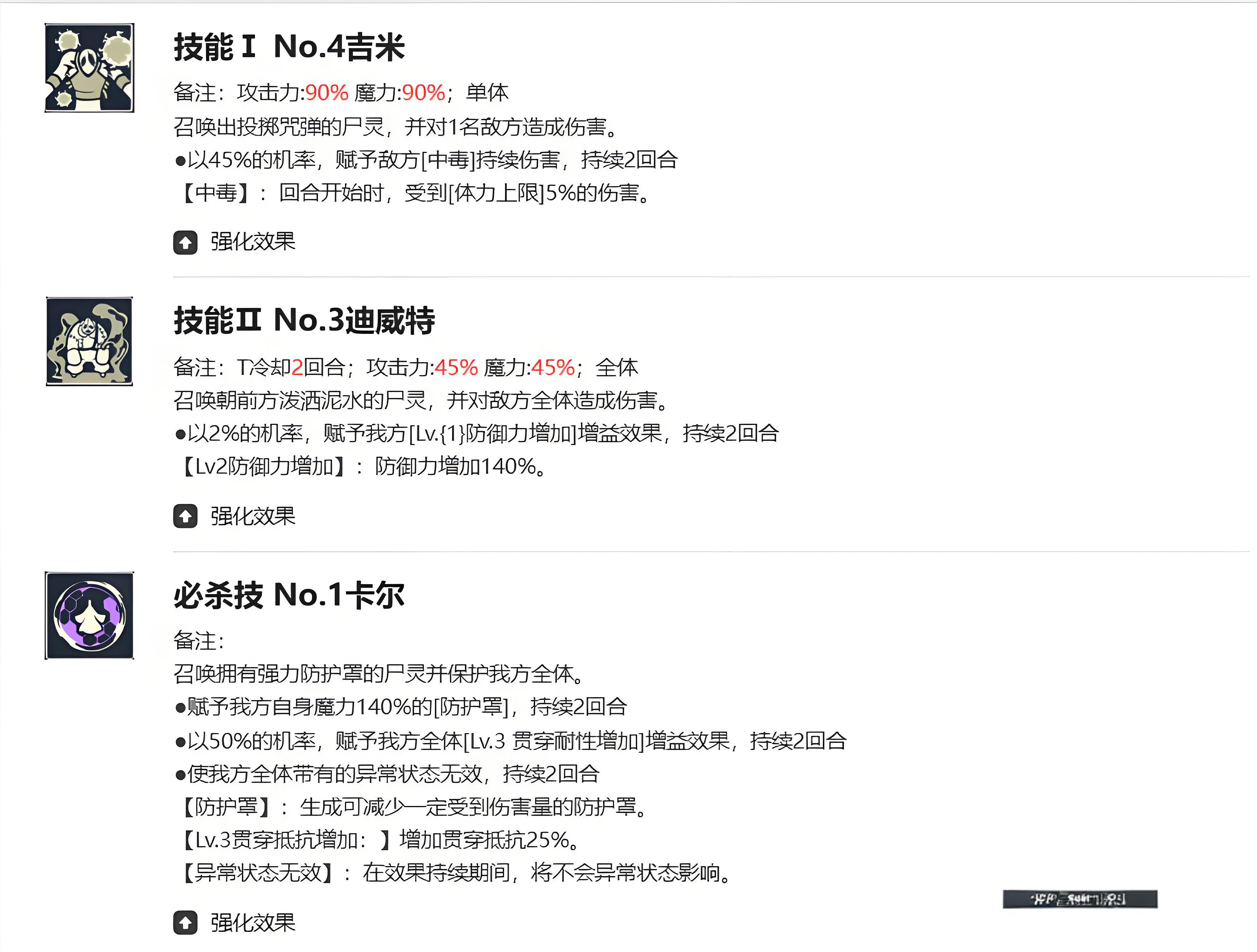 2、一技能召唤尸灵攻击单体,45%机率赋予中毒,回合初造成目标体力上限5%伤害,属无视防御的真实伤害。