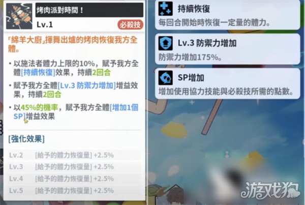 恰米的必杀技“烧烤派对时间”,不仅提供全队治疗,还能提升防御力增益,并有概率让队友获得SP,使队伍在长时间战斗中持续高效输出。技配合觉醒被动和专属被动,恰米还能在盟友回合结束时为生命值最低的队友恢复生命值,并增加自身最大生命值,为队伍提供稳定续航,让战斗打得更轻松和持续。