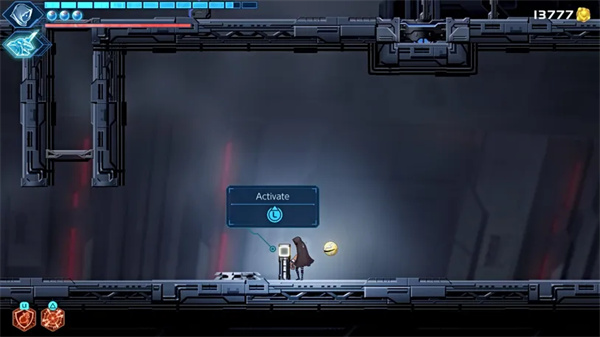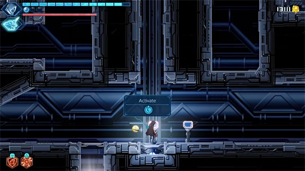 激活附近的信息亭以打开右侧的大门,然后开始从之前的区域回溯到蓝门控制面板的位置。爬过薄薄的平台进入房间并打开控制面板,打开房间两侧的大门以及反应堆下方的大门。