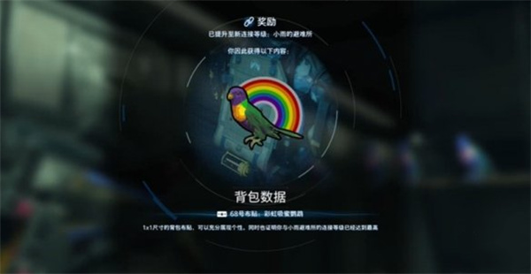 背包数据68号布贴:彩虹吸蜜鹦跳鹦鹉,1×1尺寸的背包布贴,可以充分展现个性。同时也证明你与小雨避难所的连接等级已经达到最高
