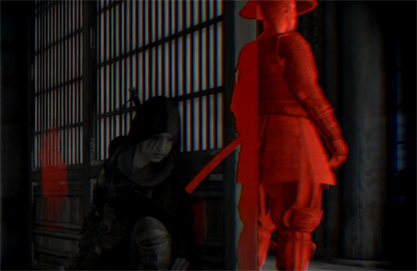 奈绪江可使用鹰眼视觉来屏蔽干扰,并高亮显示敌人(红色)、仆从(橙色)和可供利用的游戏元素(白色)。
