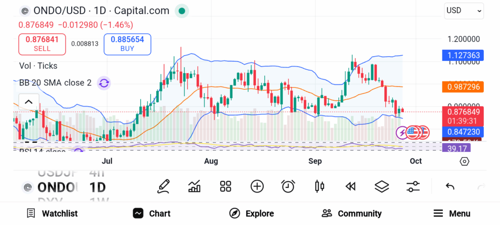 Ondo Finance专注于现实世界资产领域,该赛道正在全球市场获得关注。该代币交易价格约0.87美元,市值约27亿美元。该项目与美国最大银行摩根大通达成突破性合作,将代币化金融产品推向更广泛群体,这一合作既体现了主流机构的信任,也吸引了大量资金。近期有大额投资者单笔买入数百万美元ONDO,如此巨量买入表明对其长期增长的高度信心。