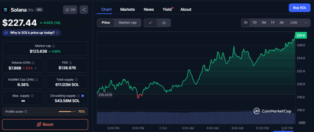CoinMarketCap数据显示,Solana在过去交易时段稳步上涨,开盘报218.44美元后收于227.44美元。价格走势呈现明确上升趋势,通过多次盘中波动积累动能。早盘下探218美元后迅速反弹走高。
