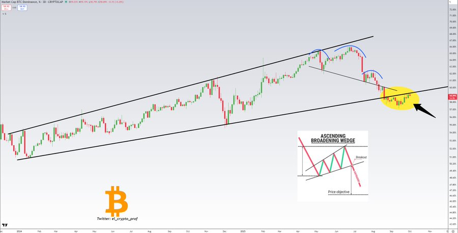 比特币主导地位数月来形成上升扩散楔形,更高的高点和低点构成该形态。其峰值曾多次触及上轨后反转,随后出现连续降低的高点,图表可见圆弧顶形态。当该形态在中轴线失去动能时,趋势开始转变。