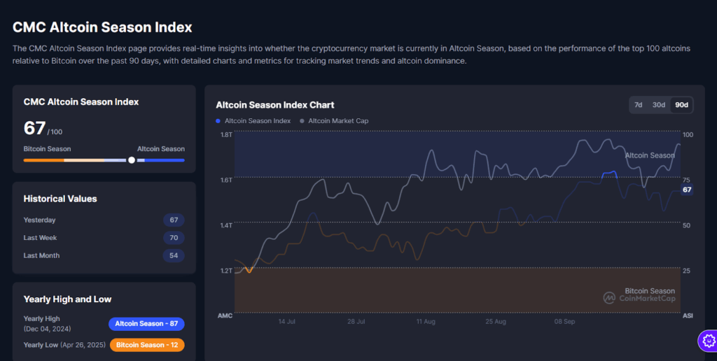 图表显示指数自七月中旬攀升,九月进入更高区间。山寨币市值同步稳步增长,峰值与指数强度吻合。指数67的现状意味着本季度山寨币持续跑赢比特币。