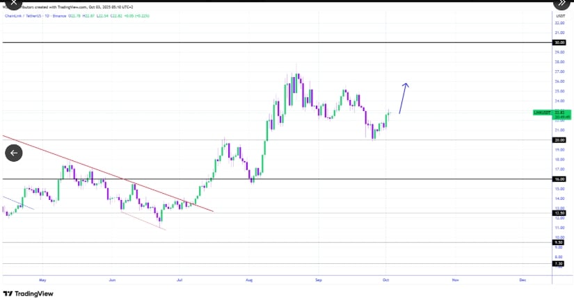 若LINK/BTC交易对强势突破日线下降趋势线,动能或将加速。该趋势线已压制价格数周,强势突破将增强各交易对的看涨逻辑。随着资产维持在20美元支撑位上方,近期冲击25美元中段的条件已趋成熟。