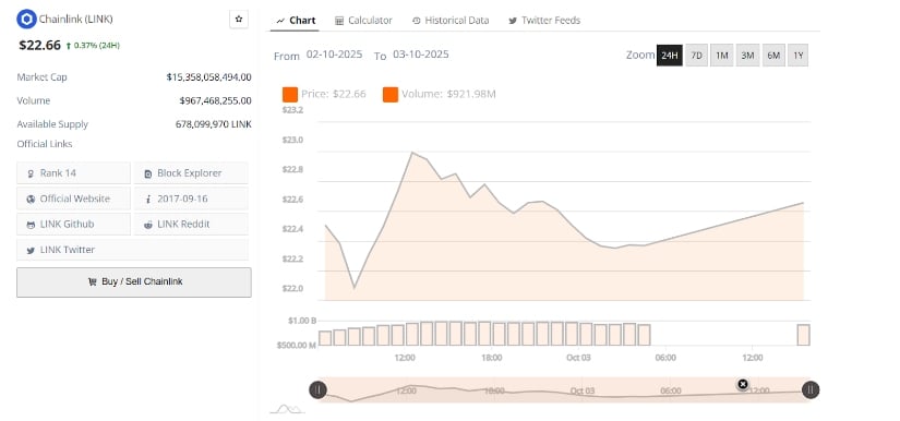 截至发稿时,Chainlink报价22.66美元,24小时微涨0.37%。该交易时段呈现震荡行情,山寨币先跌破22美元后反弹测试23美元,但未能站稳该日内高点,最终收敛于当前区间。此类波动凸显了短期阻力位对价格轨迹的关键影响。