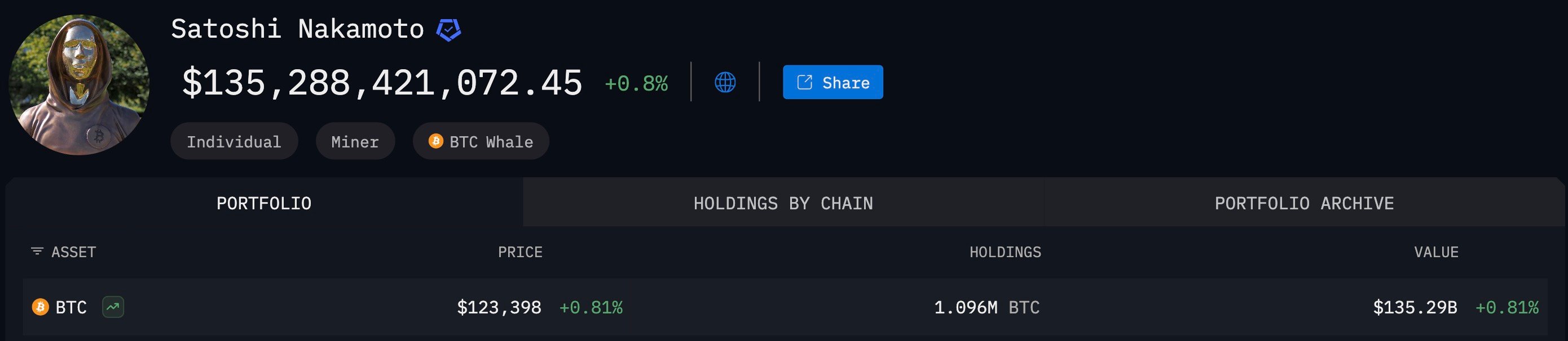 随着比特币刷新历史纪录,中本聪关联钱包估值已达惊人的1,362.88亿美元。其持有的109.6万枚BTC自2010年未移动,理论上已使其跻身全球五大富豪——与巴菲特、盖茨财富相当,接近马斯克特斯拉持股巅峰值。