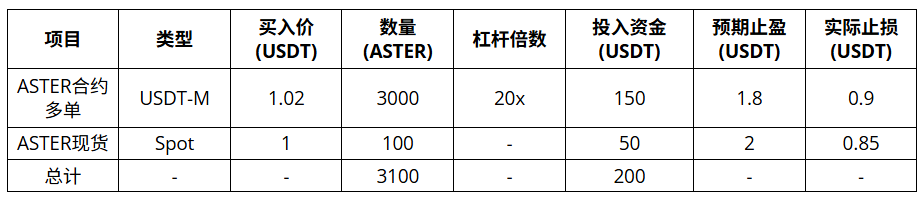 - 新仓:合约多单,投入 200 USDT(含 Bonus Pro),数量 1500 ASTER,20 x 杠杆,止损 1.40 USDT。