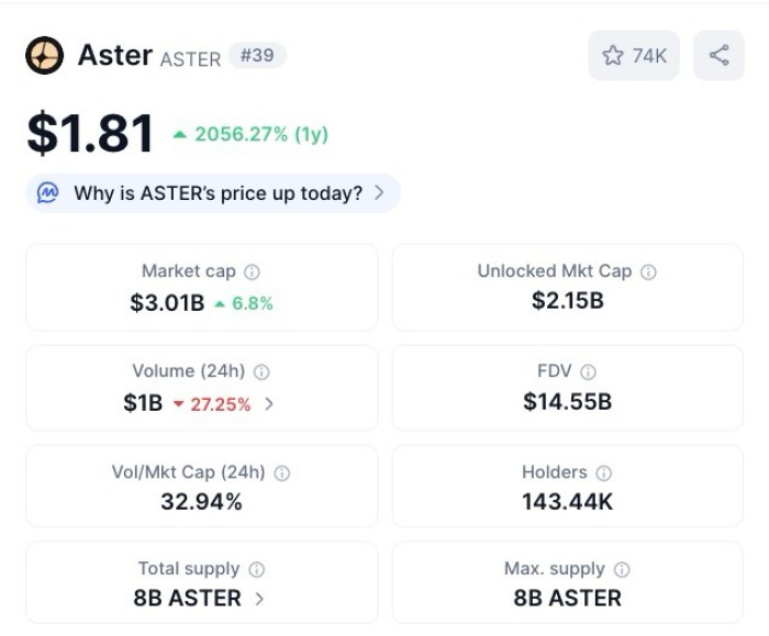 3. Aster($ASTER)——CZ背书的DEX交易量巨兽