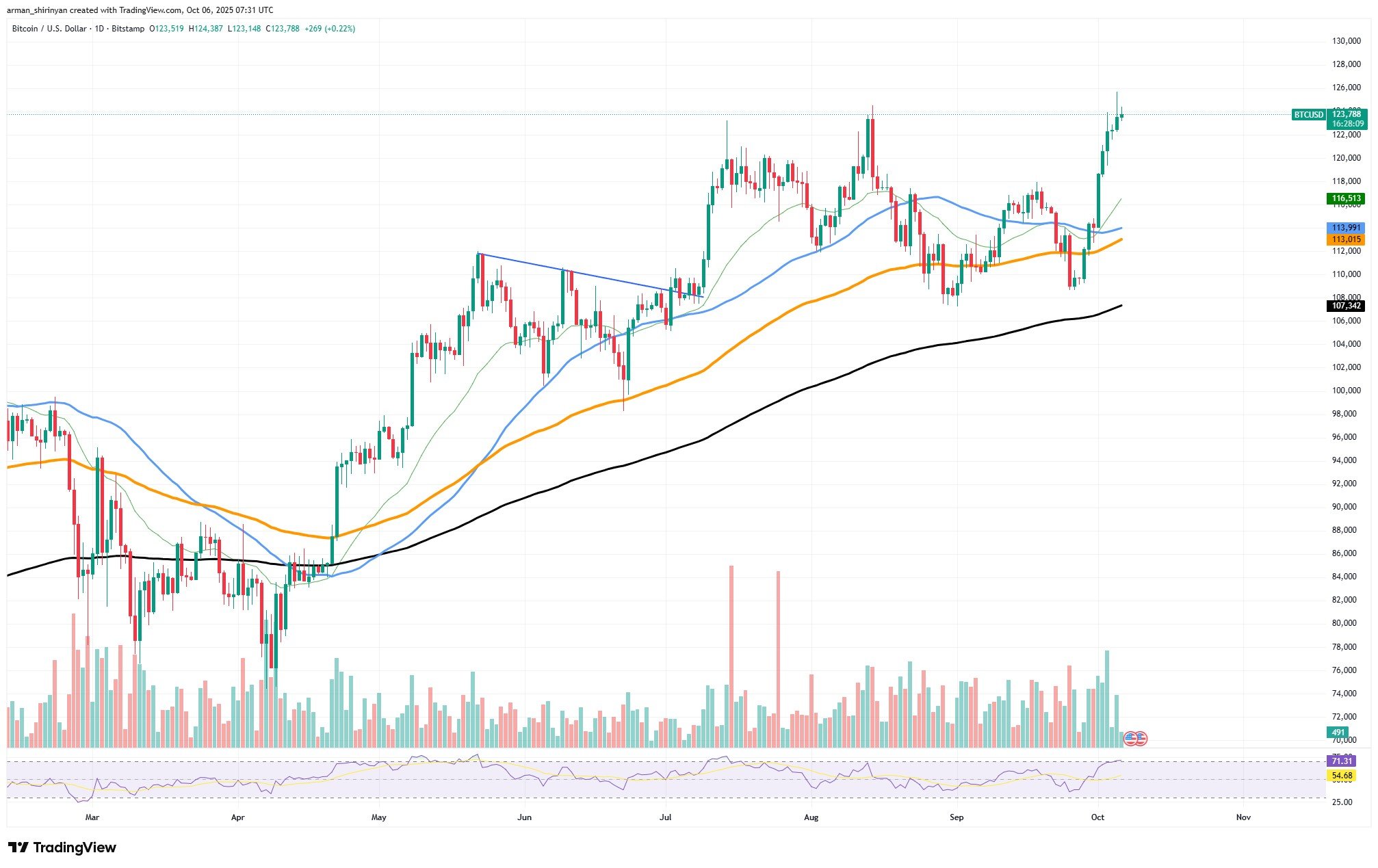 当两者几乎同时突破纪录时,这种类比正在现实中接受检验。借助100日与200日均线分析,比特币价格突破盘整后强势上涨至约12.4万美元,技术上呈现强劲上升趋势。