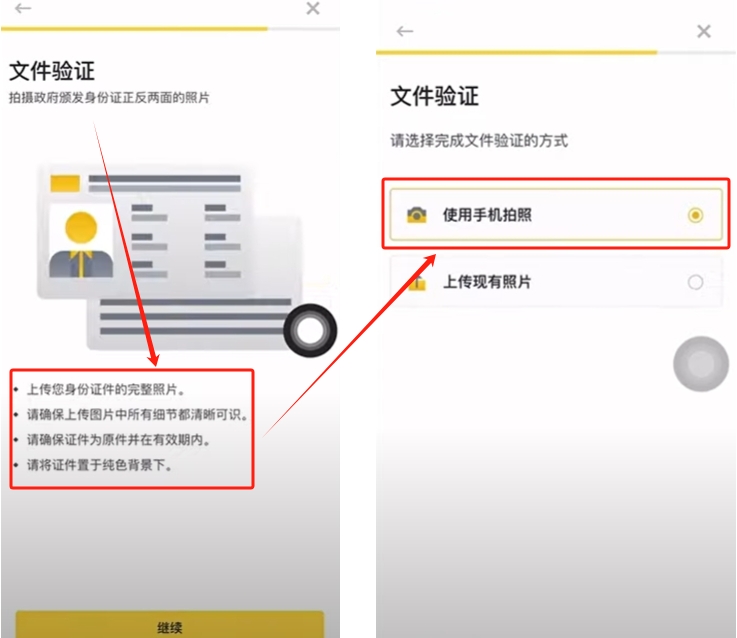 点击币安首页的【去认证】,选择你所在的国家或者是地区,身份证件可以选择身份证或者是护照。推荐大家使用身份证。选择【身份证】,点击【继续】
